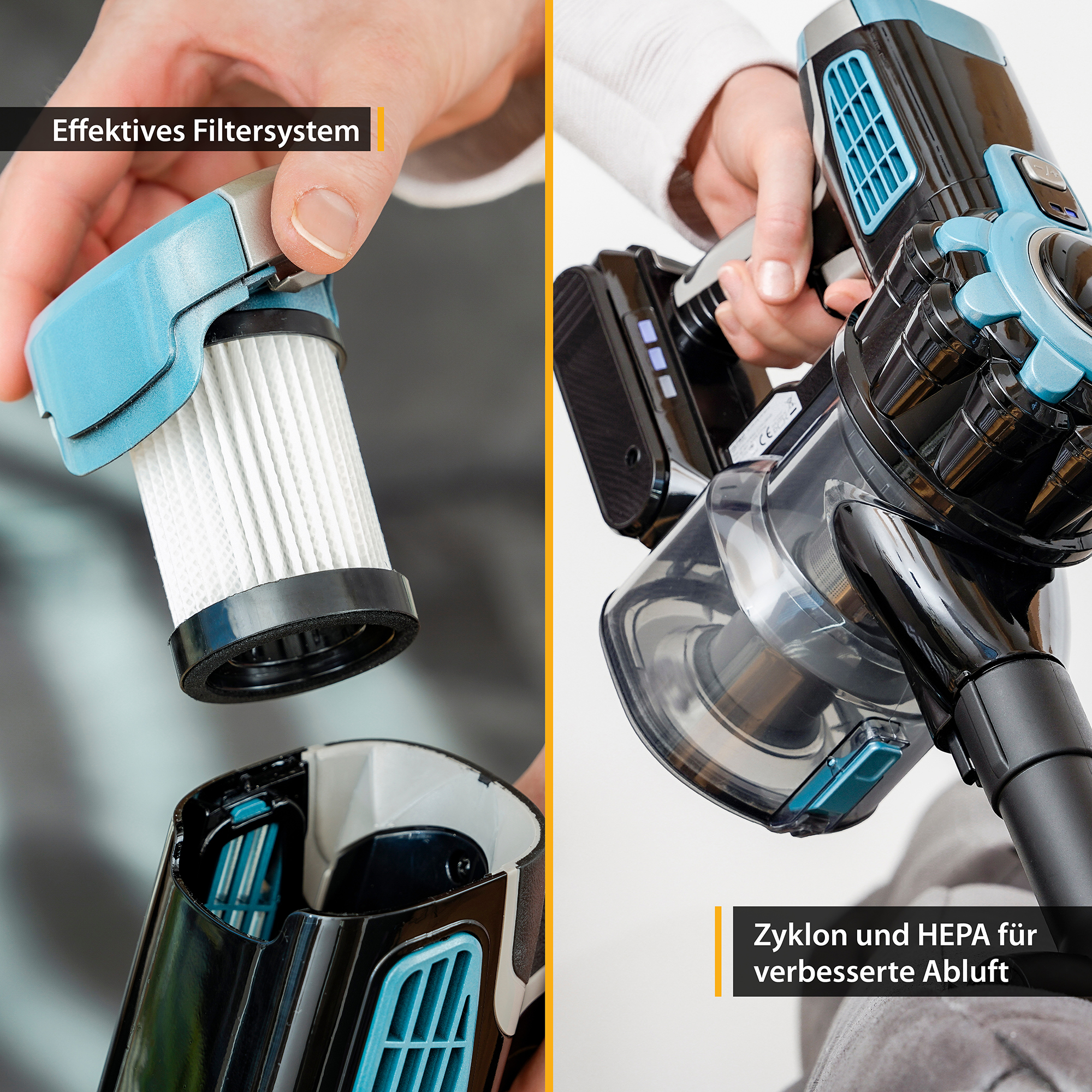 Das effiziente Filtersystem mit Zyklon- und HEPA-Filter gewährleistet zuverlässige Filtration und verbesserte Abluft für eine beispiellose Reinheit in Ihrer Umgebung. Das mühelose Entnehmen des Staubbehälters und Filters sorgt für für eine unbeschwerte Reinigung.