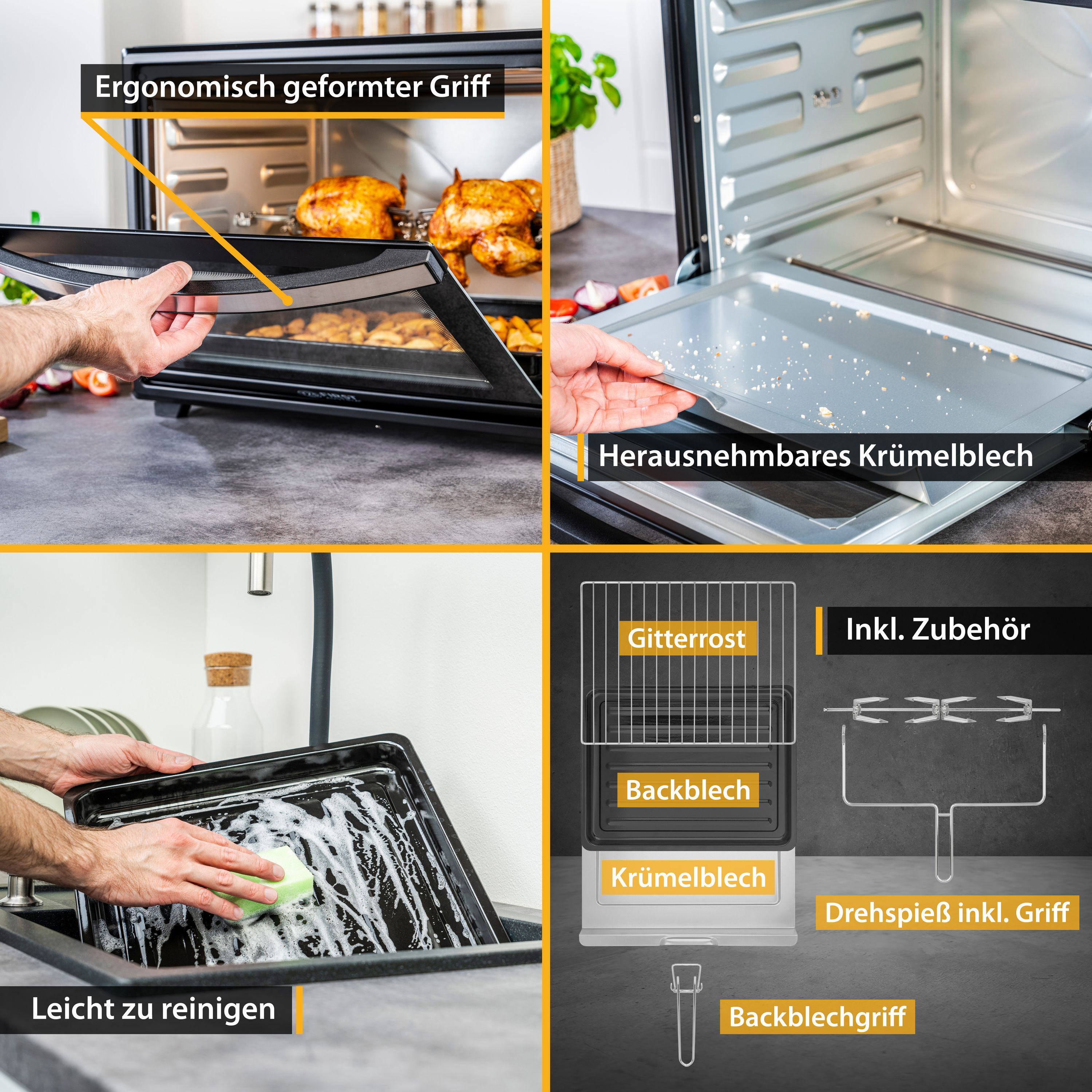 Ob Pizzas, Aufläufe oder gegrilltes Fleisch – die Umluftfunktion und der integrierte Drehspieß sorgen für köstliche Ergebnisse. Mit vier Einschubebenen und einer doppelverglasten Tür bleibt die Hitze optimal im Ofen. Das robuste Edelstahl-Design passt in jede Küche, und das herausnehmbare Krümelblech erleichtert die Reinigung.