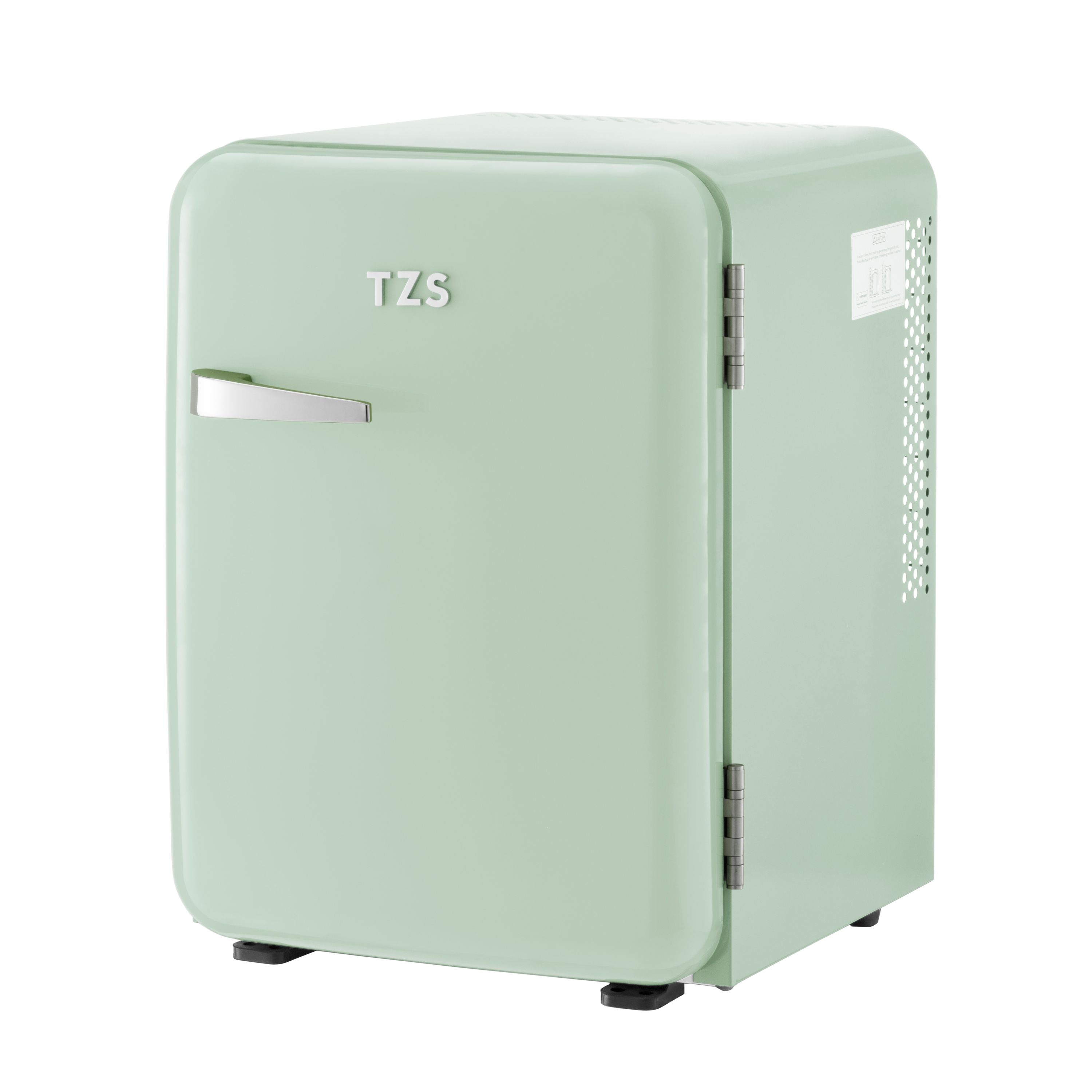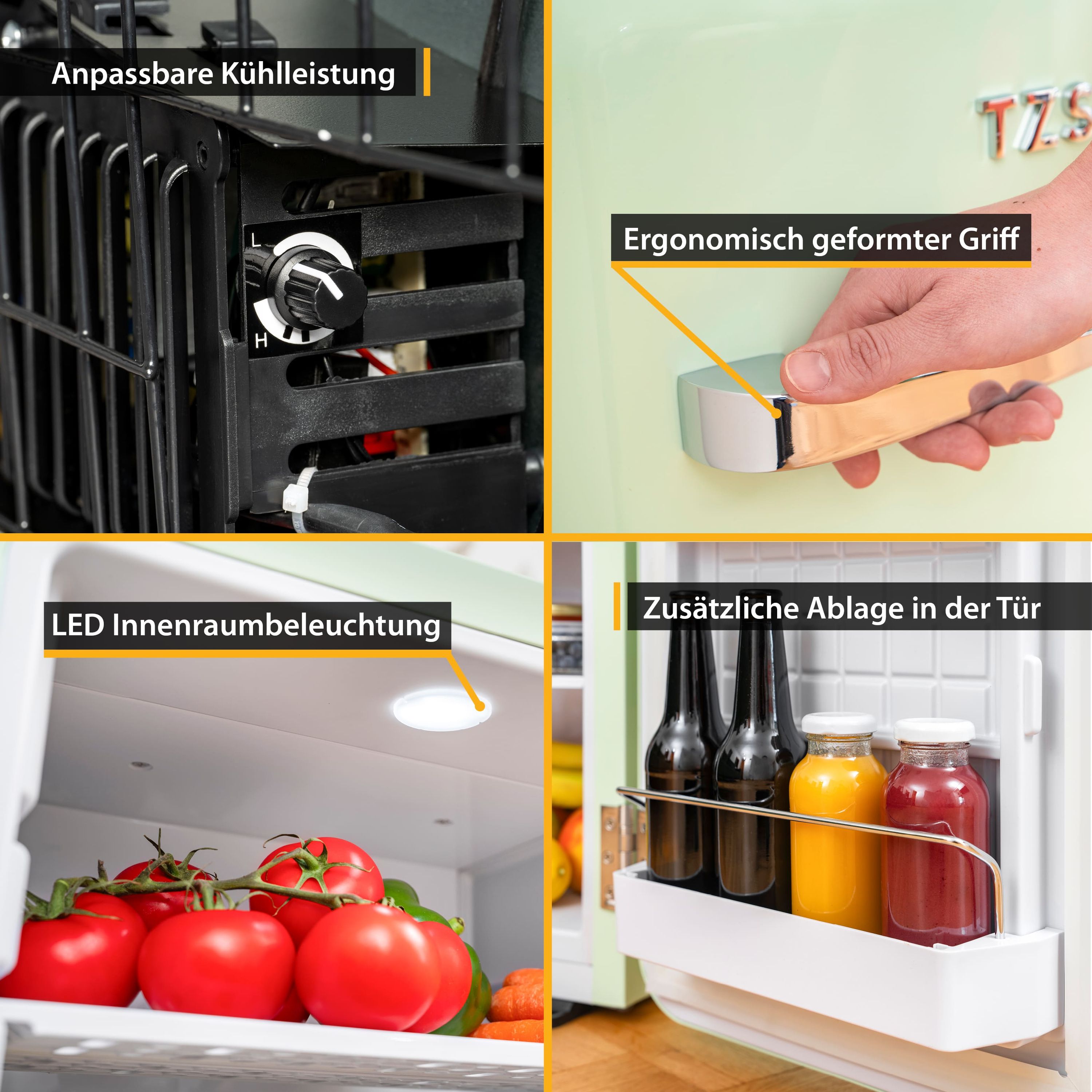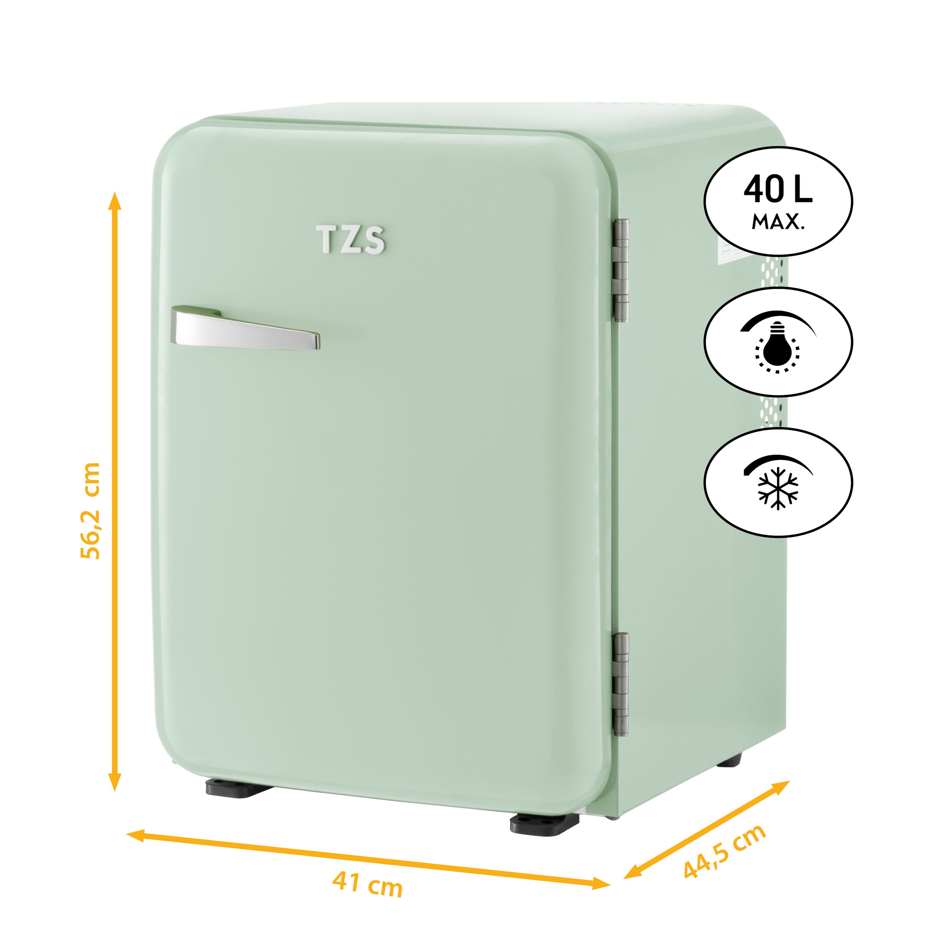 Zur Ausstattung gehören: eine Innenbeleuchtung, ein Kondenswassersammler, zwei verstellbare Türfächer und vier Kunststoffeinlegeböden zur flexiblen Nutzung. Das Highlight ist die absolut stylische Retro-Optik in unterschiedlichen Farben mit einem Hochglanz-Metall-Türgriff und dazu passenden TZS Logo.