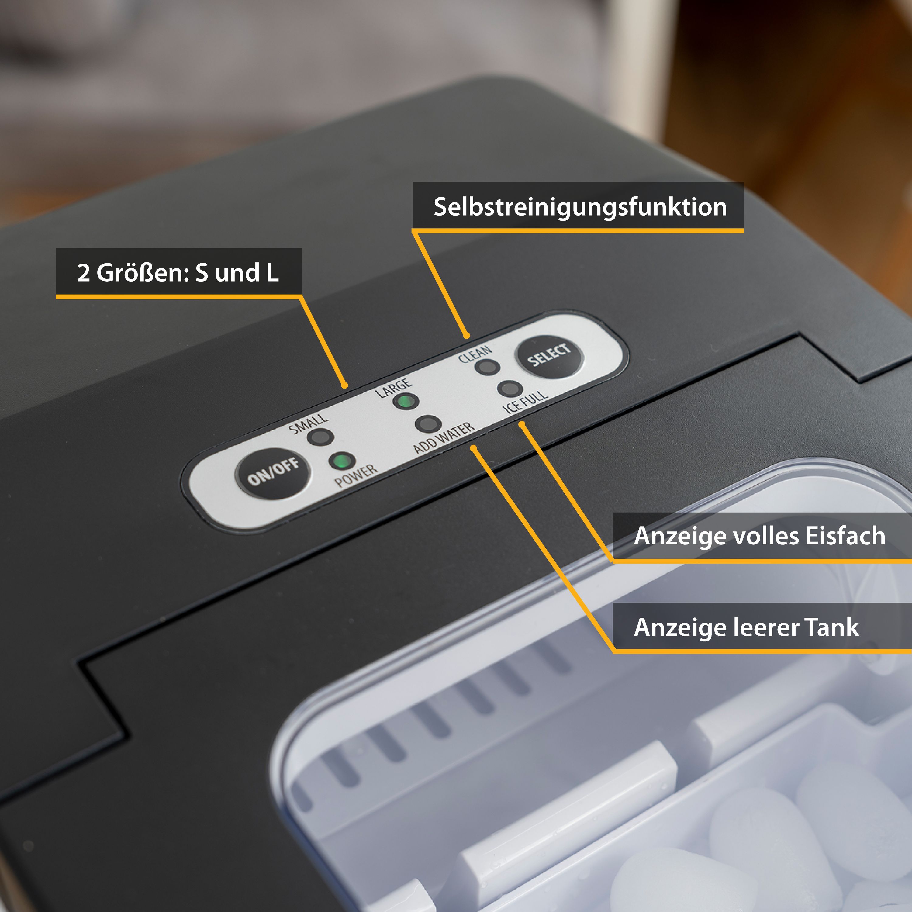 Die Bedienung des Eiswürfel Maker erfolgt über ein einfaches & übersichtliches Bedienpanel mit LED-Indikatoren. Hier können Sie zwischen den einzelnen Modi wechseln & es werden die wichtigsten Informationen jederzeit angezeigt.
