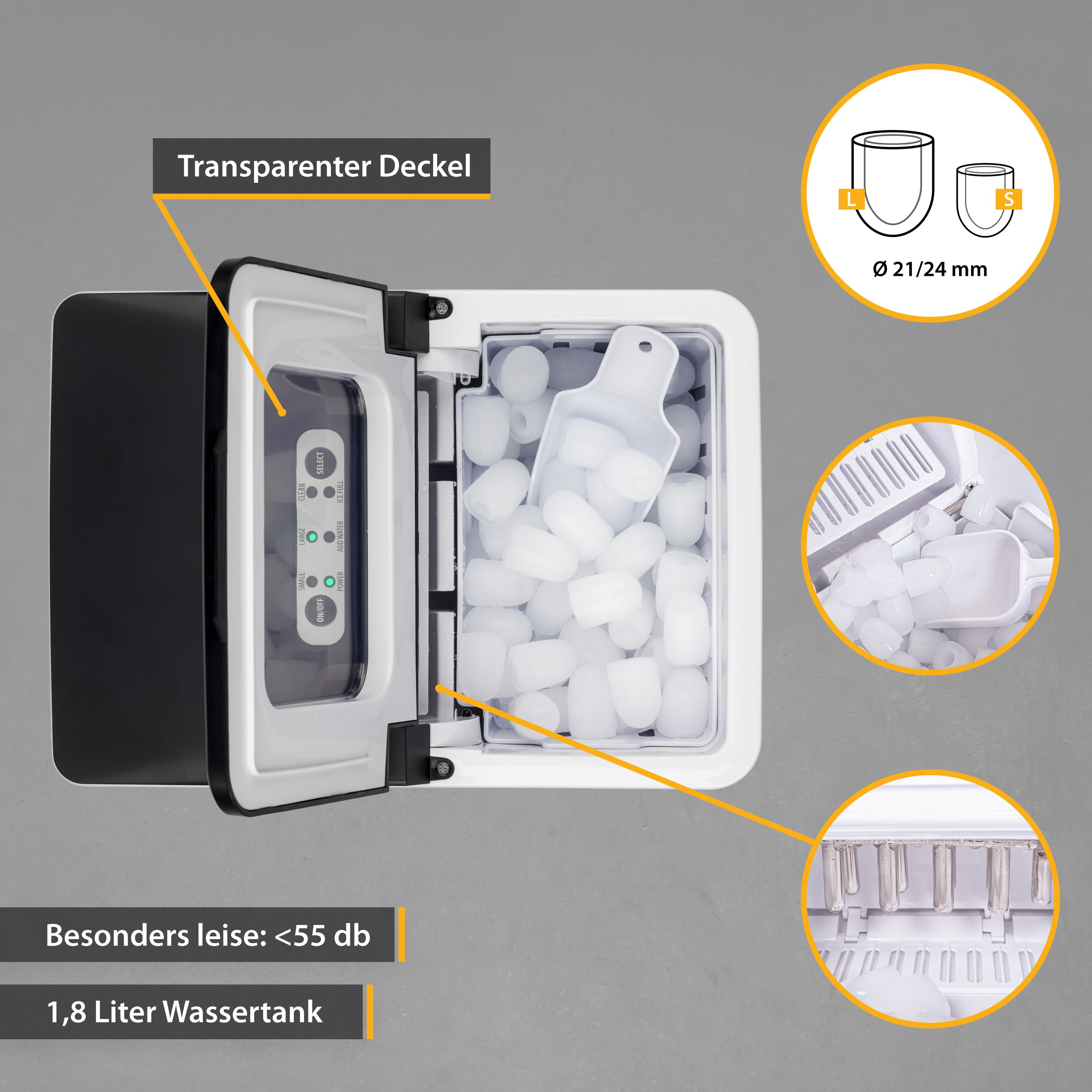 - 2 Eiswürfelgrößen mit 32mm Höhe (S = Ø 21mm, L = Ø 24mm)