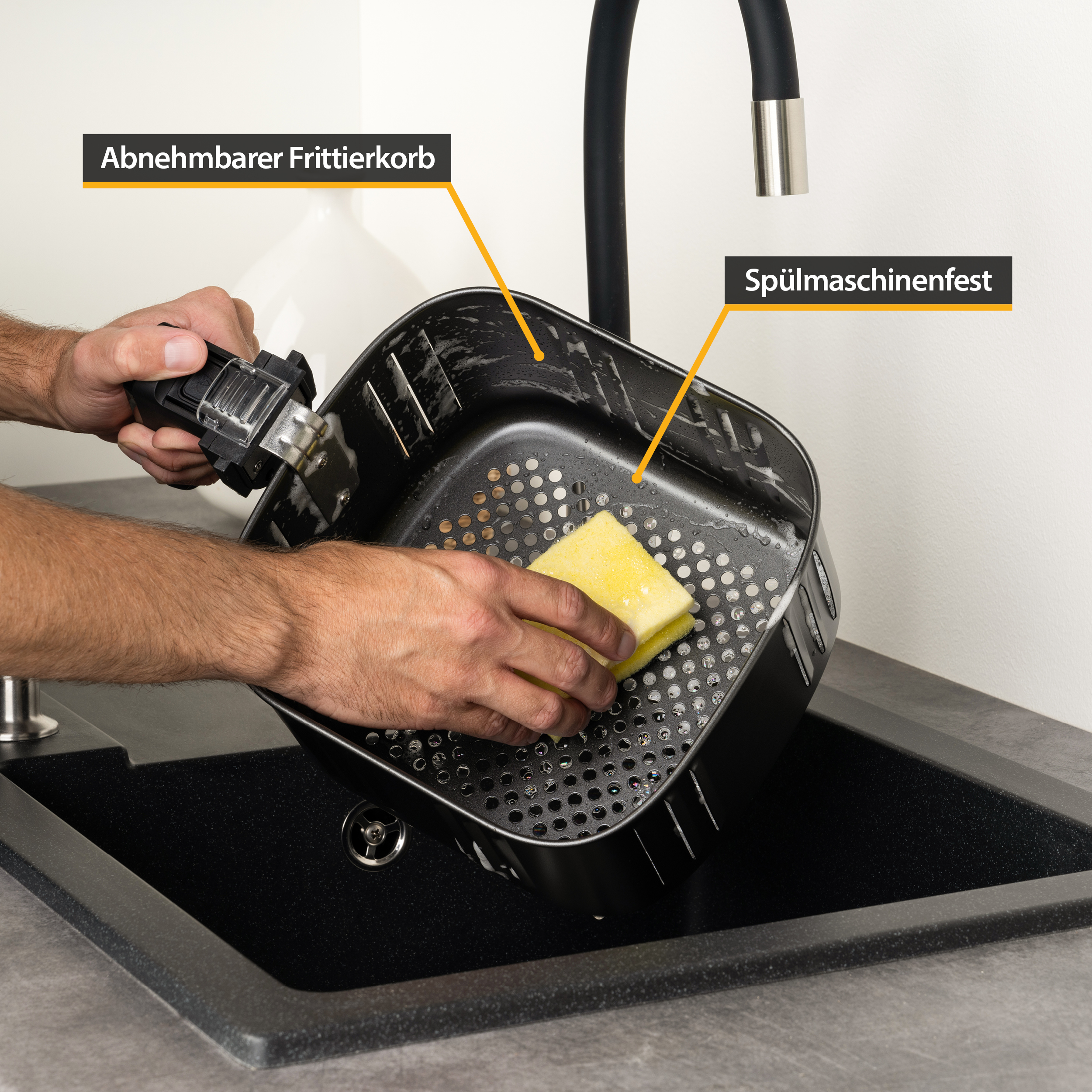 Nach dem Kochen wird die Reinigung zum Kinderspiel: Der antihaftbeschichtete Frittierkorb mit cleveren Lufteinlässen lässt sich spielend leicht reinigen und ist sogar spülmaschinenfest. So bleibt mehr Zeit für das, was wirklich zählt – genussvolle Momente mit Ihren Liebsten.