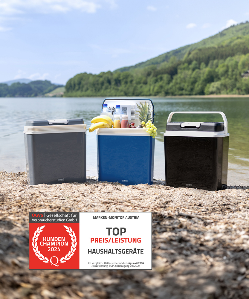 Das thermoisolierte Gehäuse ist aus strapazierfähigem Kunststoff gefertigt und steht sicher auf jedem Untergrund. Im Auto mit 12-Volt-Stecker zu betreiben oder über den 220-240-Volt-Stecker für normale Steckdosen.