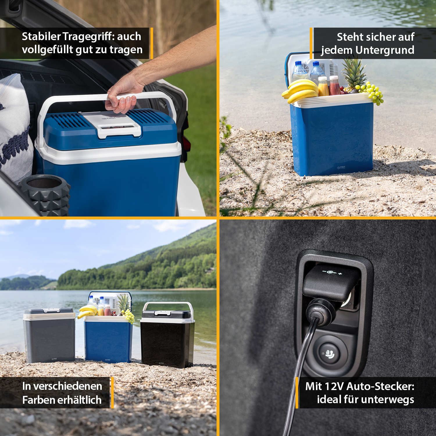 Dank einem robustem Tragegriff ist die Kühlbox auch im gefüllten Zustand leicht zu transportieren. Das thermoisolierte Gehäuse ist aus strapazierfähigem Kunststoff gefertigt und steht sicher auf jedem Untergrund.