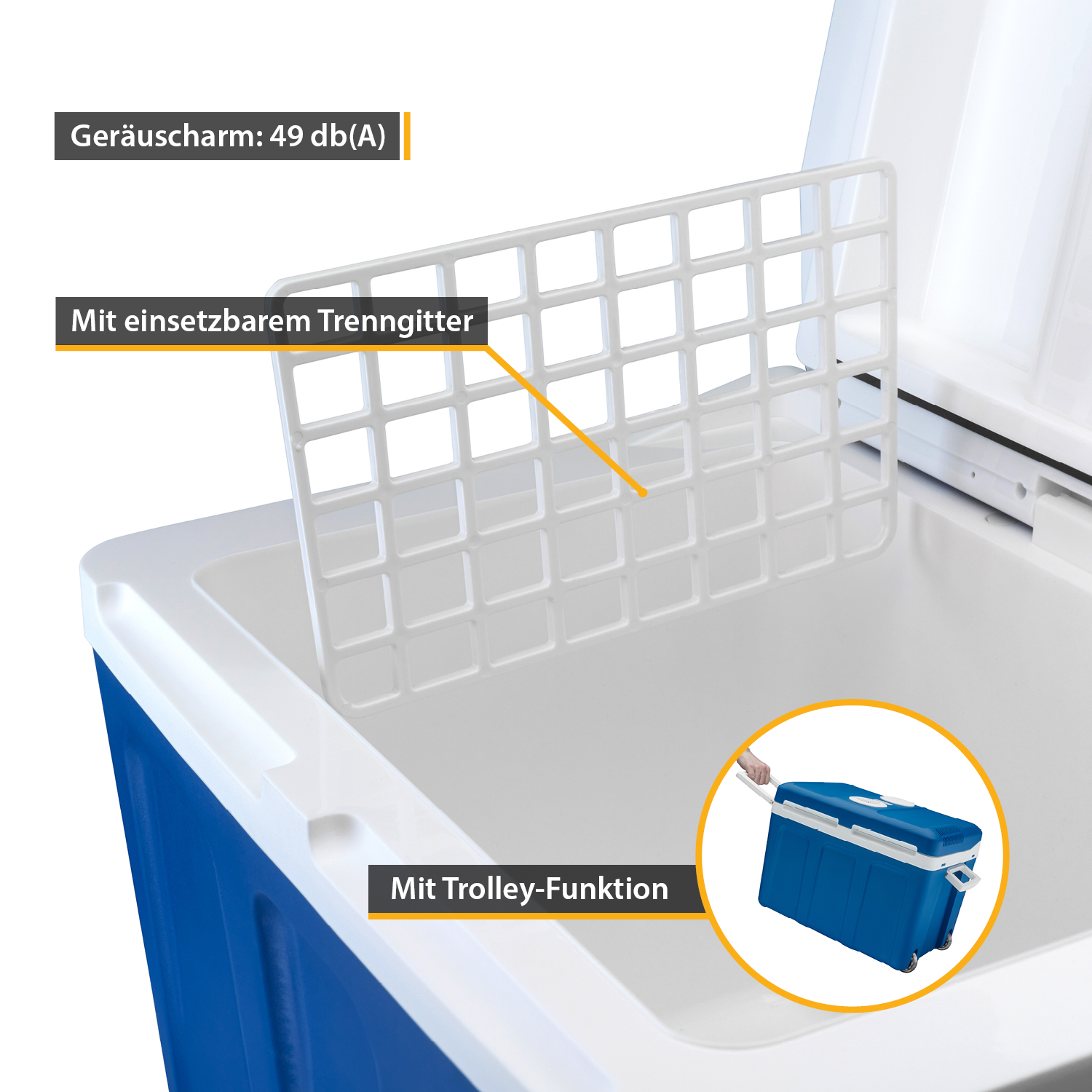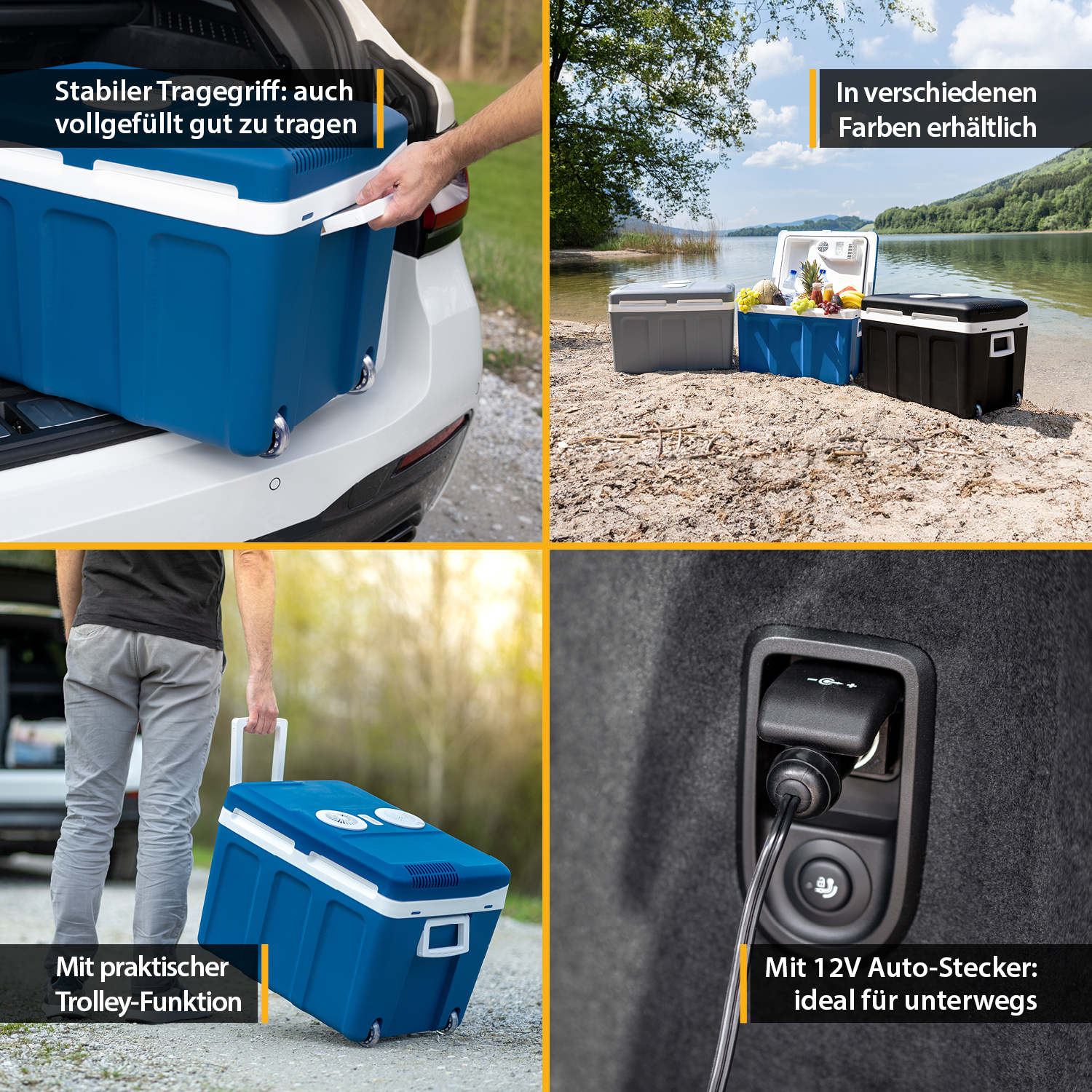 Dank integrierten Gummirollen und dem extra langen Tragegriff lässt sich die Kühlbox auch im gefüllten Zustand leicht transportieren. Das thermoisolierte Gehäuse ist aus strapazierfähigem Kunststoff gefertigt und steht sicher auf jedem Untergrund. Senkrecht aufgestellt ist die Box außerdem als mobiler Mini-Kühlschrank verwendbar.