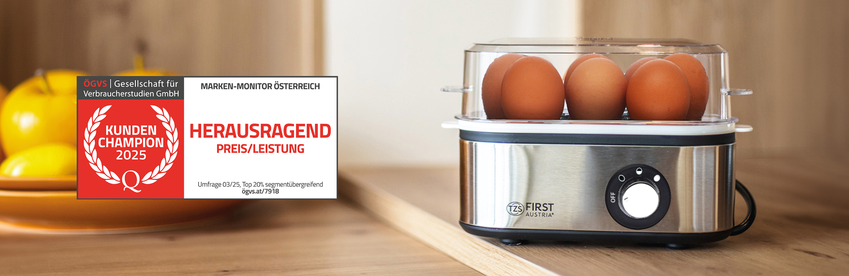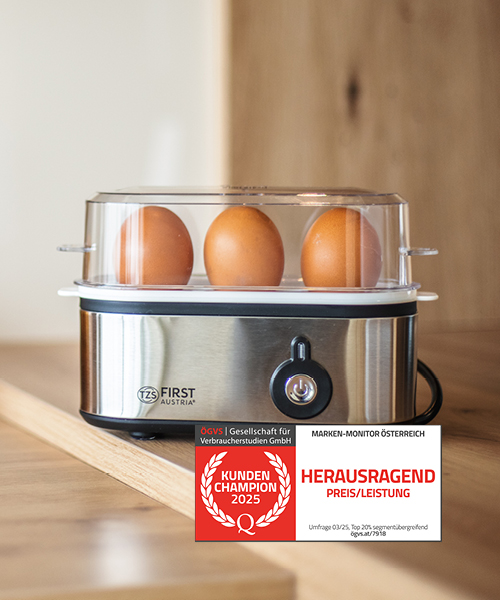 First Austria Elektrischer Eierkocher, einstellbarer Thermostat Kochen Sie bis zu 3 Eier auf einmal im Eierkocher. Die Härte des Eies hängt von der Menge des verwendeten Wassers ab. Verpassen Sie nie wieder das Kochen Ihrer Eier! Stechen Sie mit dem Eistift ein paar Löcher hinein, damit sie beim Kochen nicht brechen. Legen Sie die Eier auf die Eierablage und geben Sie mit dem beiliegenden Messbecher die gewünschte Menge Wasser hinzu, um hartgekochte, weichgekochte oder halbgekochte Eier zu erhalten. Einmal gekocht, können die Eier bis zum Verzehr warm gehalten werden. Stellen Sie den Eierkocher zu Ihrer Sicherheit auf eine ebene, trockene Fläche. Schließen Sie das Netzkabel an eine geerdete Steckdose an. Die Kontrollleuchte leuchtet auf, um Ihnen zu signalisieren, dass das Gerät eingeschaltet ist. Ein effizienter und vielseitiger Eierkocher: bis zu 3 Eier Akustisches Signal Zubehör: Messbecher mit Einstichnadel Automatische Abschaltung Lieferumfang: - 1 x Elektrischer Eierkocher von TZS First AustriaTZS First Austria steht seit über 30 Jahren für Qualität, Zuverlässigkeit und Innovation. Entdecken Sie eine Vielzahl an Qualitätsprodukten für den Haushalt, die Ihnen den Alltag erleichtern. Mit modernen attraktiven Designs verleihen Sie Ihrem Zuhause einen besonderen Touch – und das stilvoll und erschwinglich.