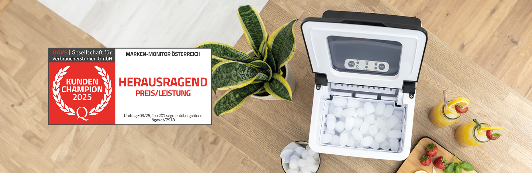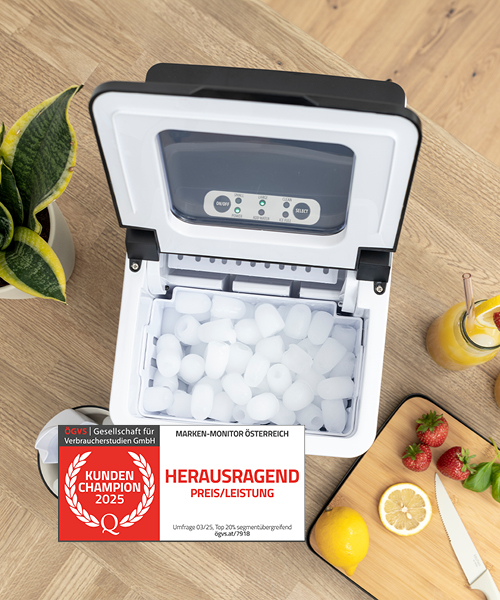 TZS First Austria Eiswürfelmaschine 1,8 Liter, schwarzAuf jeder Party kühle Drinks!Dank des effizienten Kühlkompressors erzeugt der TZS Ice Maker Eiswürfel schneller als sie schmelzen können. In Summe erreicht die Eismaschine somit unglaubliche 9 Stk in 8 Min oder 12 kg Eis pro Tag. Zurücklehnen und genießen! Damit deine Eiswürfel die perfekte Größe für jeden Anlass haben, können Sie zwischen groß (Ø24 mm) und klein (Ø21 mm) wählen. Die TZS Eiswürfelmaschine sorgt auf jeder Party für die perfekte Abkühlung. Die Bedienung des Eiswürfel Maker erfolgt über ein einfaches & übersichtliches Bedienpanel mit LED-Indikatoren. Hier können Sie zwischen den einzelnen Modi wechseln & es werden die wichtigsten Informationen jederzeit angezeigt. 2 Eiswürfelgrößen mit 32mm Höhe (S = Ø 21mm, L = Ø 24mm) Übersichtliches Bedienpanel mit LED-Indikatoren 9 Stück in 8 Min, ca. 12 kg / 24 Stunden ca. 12 kg / 24 Stunden Geräuschpegel <55dB(A) Inklusive Zubehör: Schaufel und abnehmbarer Korb Lieferumfang: 1x Eiswürfelmaschine inkl. Schaufel und abnehmbarem Korb von TZS First Austria TZS First Austria steht seit rund 30 Jahren für Qualität, Zuverlässigkeit und Innovation. Entdecken Sie eine Vielzahl an Qualitätsprodukten für den Haushalt, die Ihnen den Alltag erleichtern. Mit modernen attraktiven Designs verleihen Sie Ihrem Zuhause einen besonderen Touch – und das stilvoll und erschwinglich.