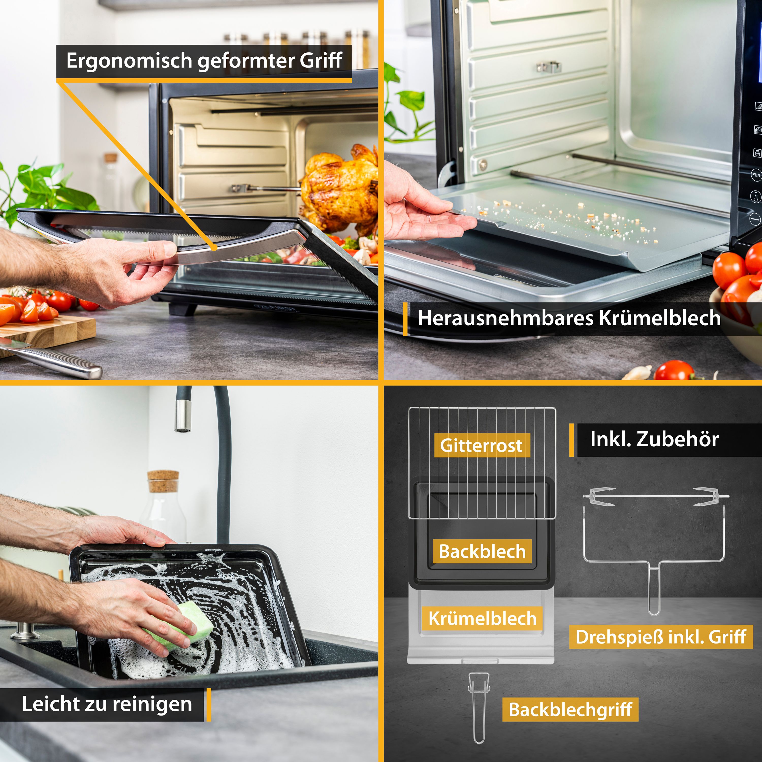 - 1x Minibackofen, 1x Grillrost, 1x Backblech, 1x Krümelblech, 1x Drehspieß, 1x Rezeptheft von TZS First Austria