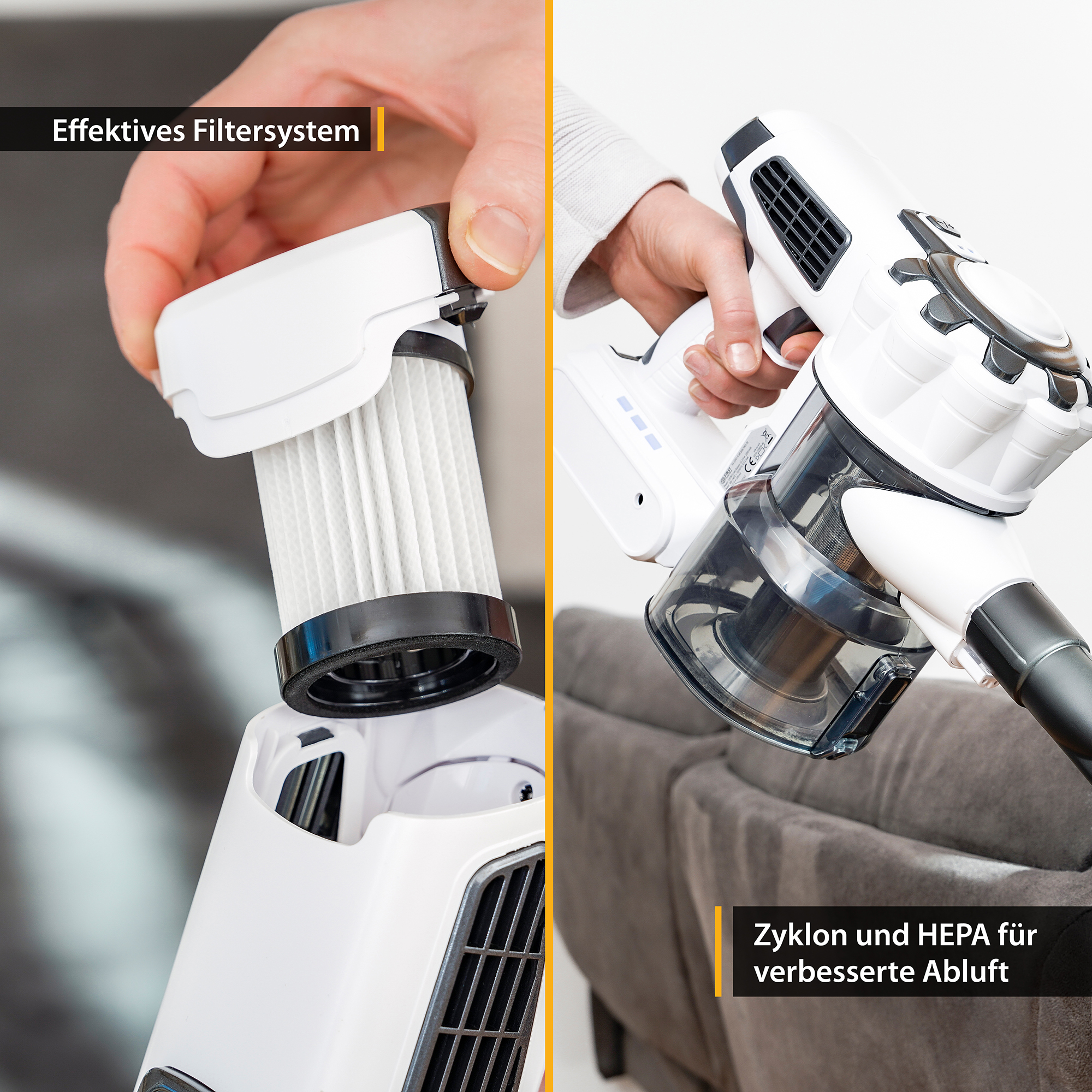 Das effiziente Filtersystem mit Zyklon- und HEPA-Filter gewährleistet zuverlässige Filtration und verbesserte Abluft für eine beispiellose Reinheit in Ihrer Umgebung. Das mühelose Entnehmen des Staubbehälters und Filters sorgt für für eine unbeschwerte Reinigung.