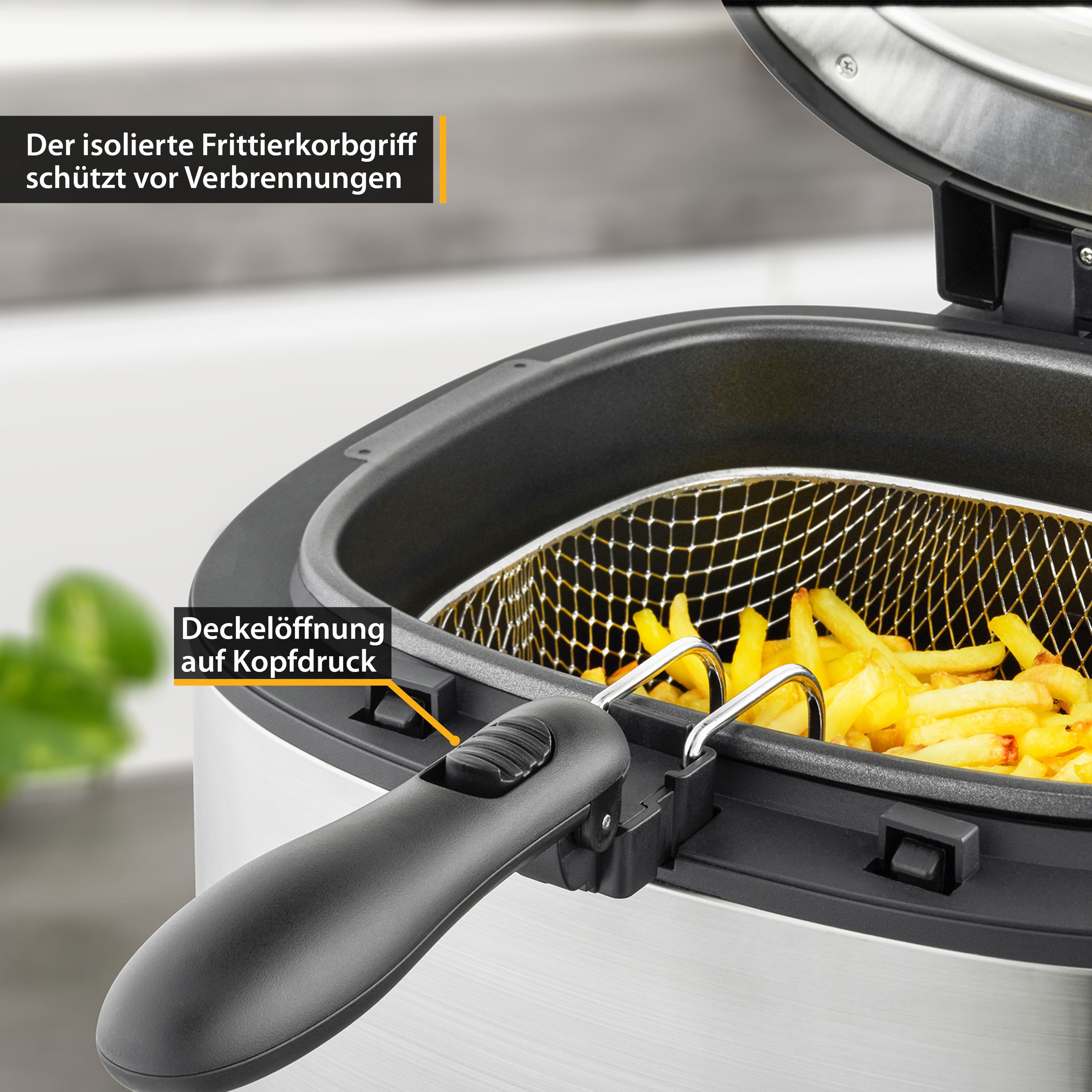 Das Glasfenster im Deckel ermöglicht Ihnen stets einen Blick auf das Frittiergut, während der integrierte Geruchsschutzfilter unerwünschte Öldämpfe in der Küche und der gesamten Wohnung reduziert.