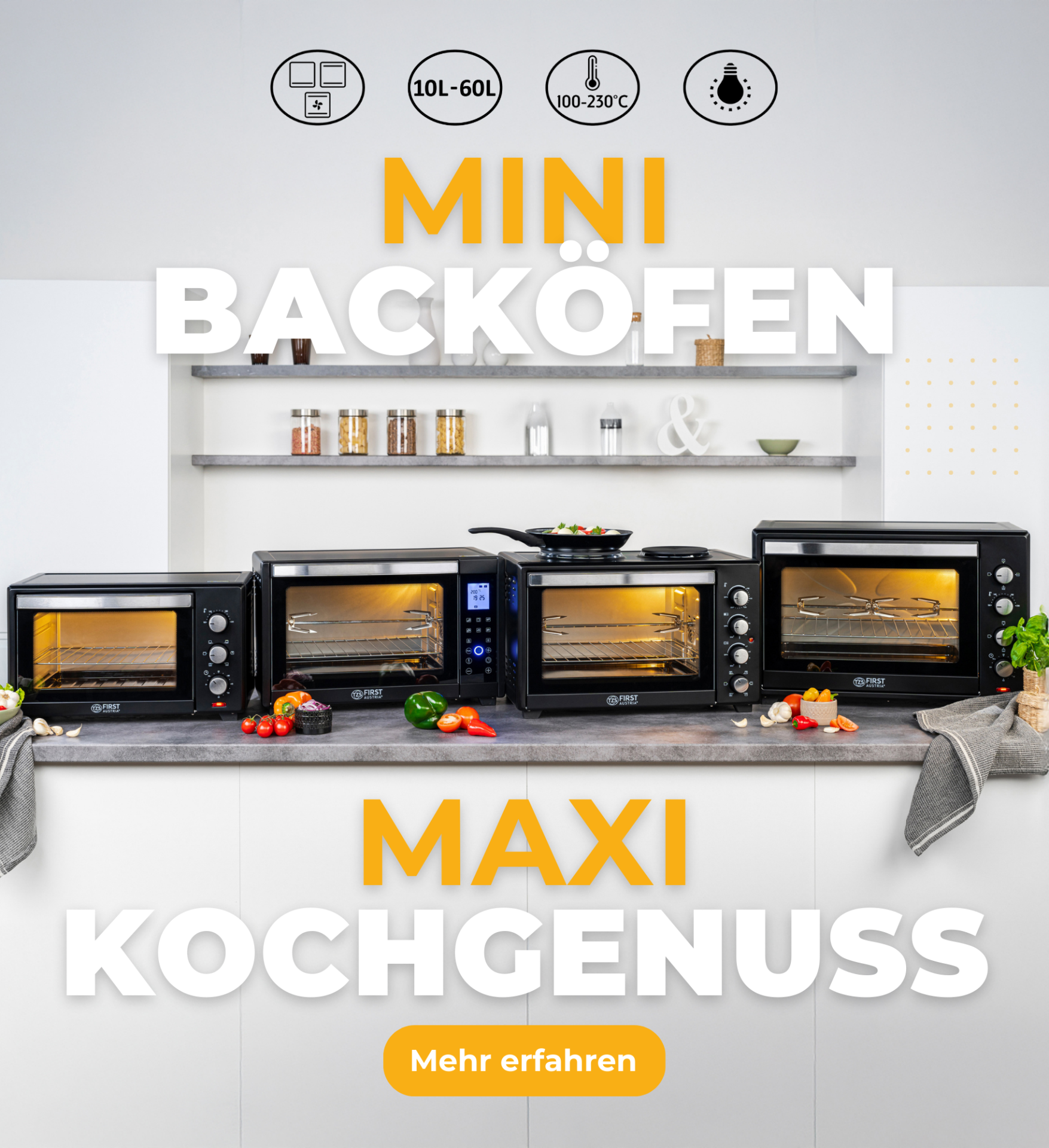 TZS First Austria Minibackofen, 2000 Watt, 60L,Kochgenuss auf den Punkt! Vergessen Sie missratene Gerichte – mit dem TZS First Austria Mini-Backofen gelingt Ihnen jedes Essen perfekt. Dieser elektrische Mini-Backofen mit 2000 Watt Leistung erreicht bis zu 230 °C und sorgt beim Backen, Grillen und Rösten für optimale Ergebnisse. Die praktische Timer-Funktion mit automatischer Abschaltung lässt Sie entspannt bleiben, während die Innenbeleuchtung jederzeit einen Blick auf Ihre Speisen ermöglicht. Ob Pizzas, Aufläufe oder gegrilltes Fleisch – die Umluftfunktion und der integrierte Drehspieß sorgen für köstliche Ergebnisse. Mit vier Einschubebenen und einer doppelverglasten Tür bleibt die Hitze optimal im Ofen. Das robuste Edelstahl-Design passt in jede Küche, und das herausnehmbare Krümelblech erleichtert die Reinigung. Der TZS First Austria Mini-Backofen ist der perfekte Küchenhelfer – kompakt, vielseitig und leistungsstark. Ideal für kleine Snacks und große Mahlzeiten. Entdecken Sie die Möglichkeiten dieses praktischen Geräts und genießen Sie köstliche Gerichte mühelos! • 60 Liter Fassungsvermögen• 2000 Watt Leistung• Gleichmäßige Hitze bis 230 °C Lieferumfang: - 1x Minibackofen, Grillgitter, 1x Backblech, 1x Krümelblech, 1x Drehspieß von TZS First Austria. TZS First Austria steht seit rund 30 Jahren für Qualität, Zuverlässigkeit und Innovation. Entdecken Sie eine Vielzahl an Qualitätsprodukten für den Haushalt, die Ihnen den Alltag erleichtern. Mit modernen attraktiven Designs verleihen Sie Ihrem Zuhause einen besonderen Touch – und das stilvoll und erschwinglich.